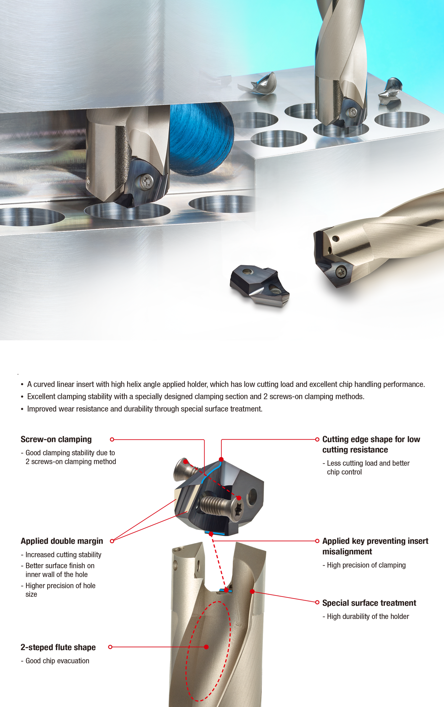 TPDB-DS is a Drill designed for machining medium/large diameter workpieces, applying a strong clamping structure. The specially designed clamping system and screw clamping method enable stable machining in high cutting load machining environments. Additionally, the double-margin design provides excellent hole surface finish and precision.