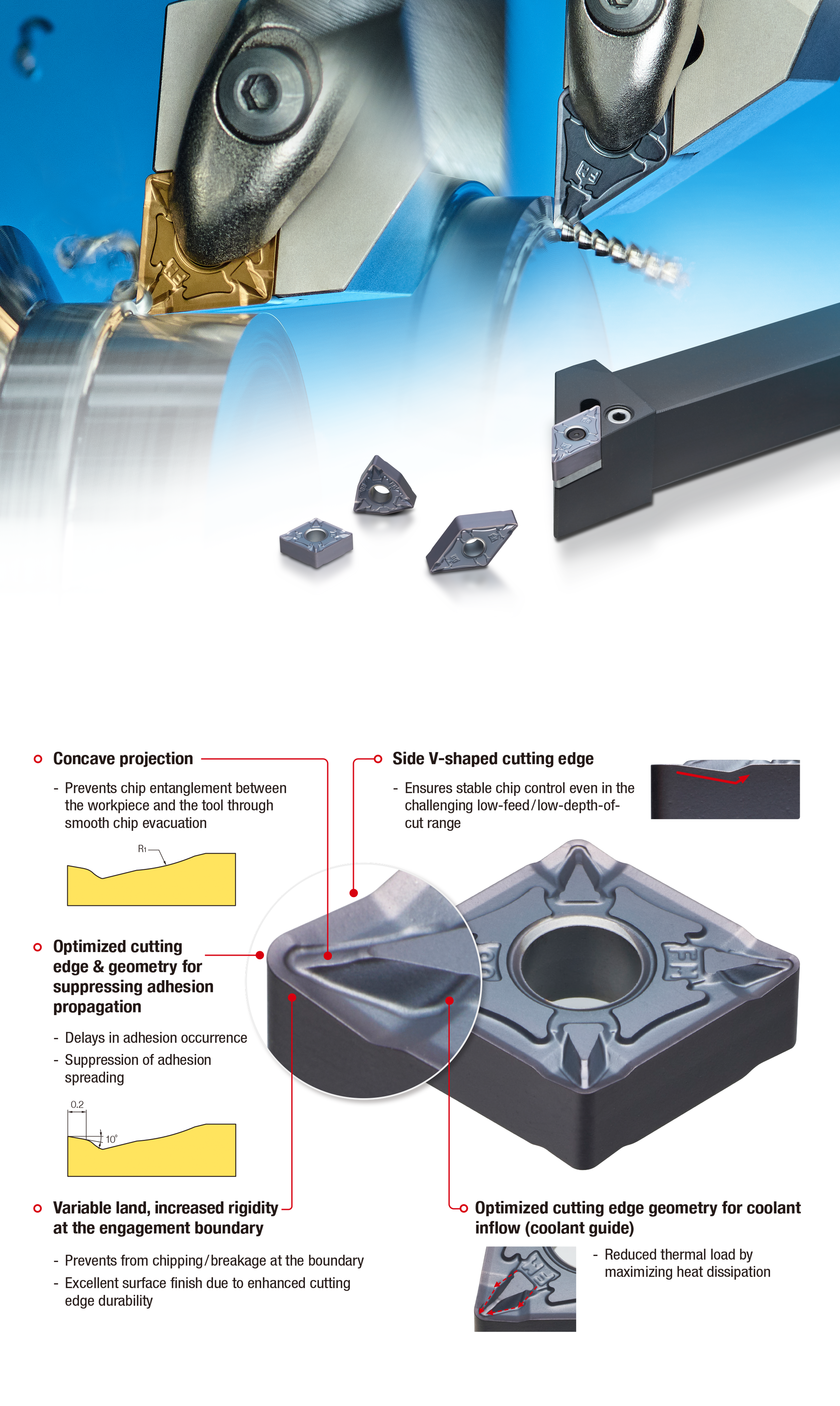 The FM chip breaker maximizes chip management during low depth-of-cut and low feed machining with its side V-shaped cutting edge and concave projection design. The anti-welding suppression geometry on the bottom dramatically enhances tool life when machining stainless steel. In addition, due to its high manufacturing quality, it offers outstanding dimensional accuracy.