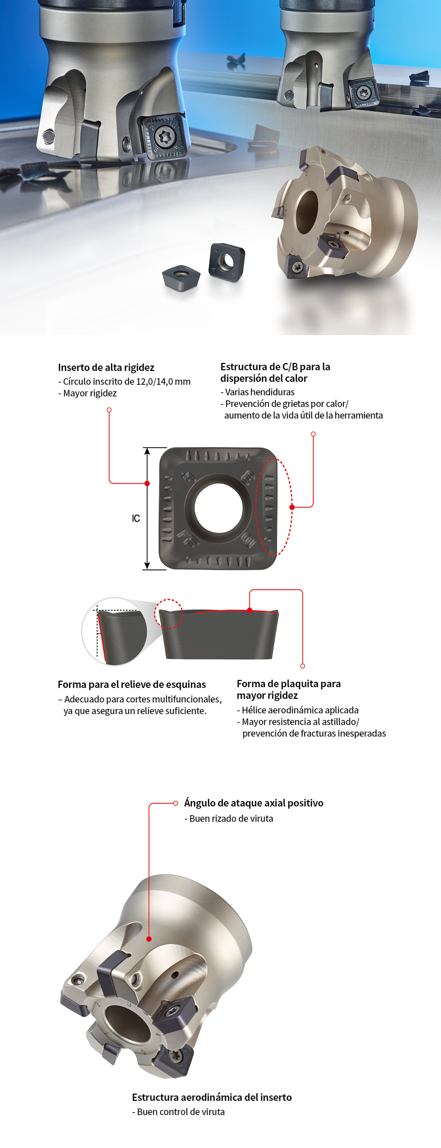 El HQM presenta una estructura helicoidal optimizada en el diseño de su plaquita y un sistema de sujeción de alta rigidez que reduce la resistencia al corte durante operaciones de corte y rampa de alto avance, previniendo la fractura del inserto y manteniendo una vida útil estable. Además, la geometría positiva y el diseño del rompevirutas permiten una gestión eficiente de la viruta, protegiendo tanto el inserto como la pieza de trabajo de daños, prolongando así la vida útil de la herramienta y garantizando un acabado superficial limpio. Asimismo, el mayor espesor del inserto y la aplicación de tornillos de gran tamaño en el sistema de sujeción de alta rigidez, junto con una estructura superficial con hoyuelos que controla eficazmente el calor generado durante el mecanizado, permiten un aumento de más del 20 % en la velocidad de avance en comparación con el mecanizado convencional de alto avance, lo que mejora la productividad.