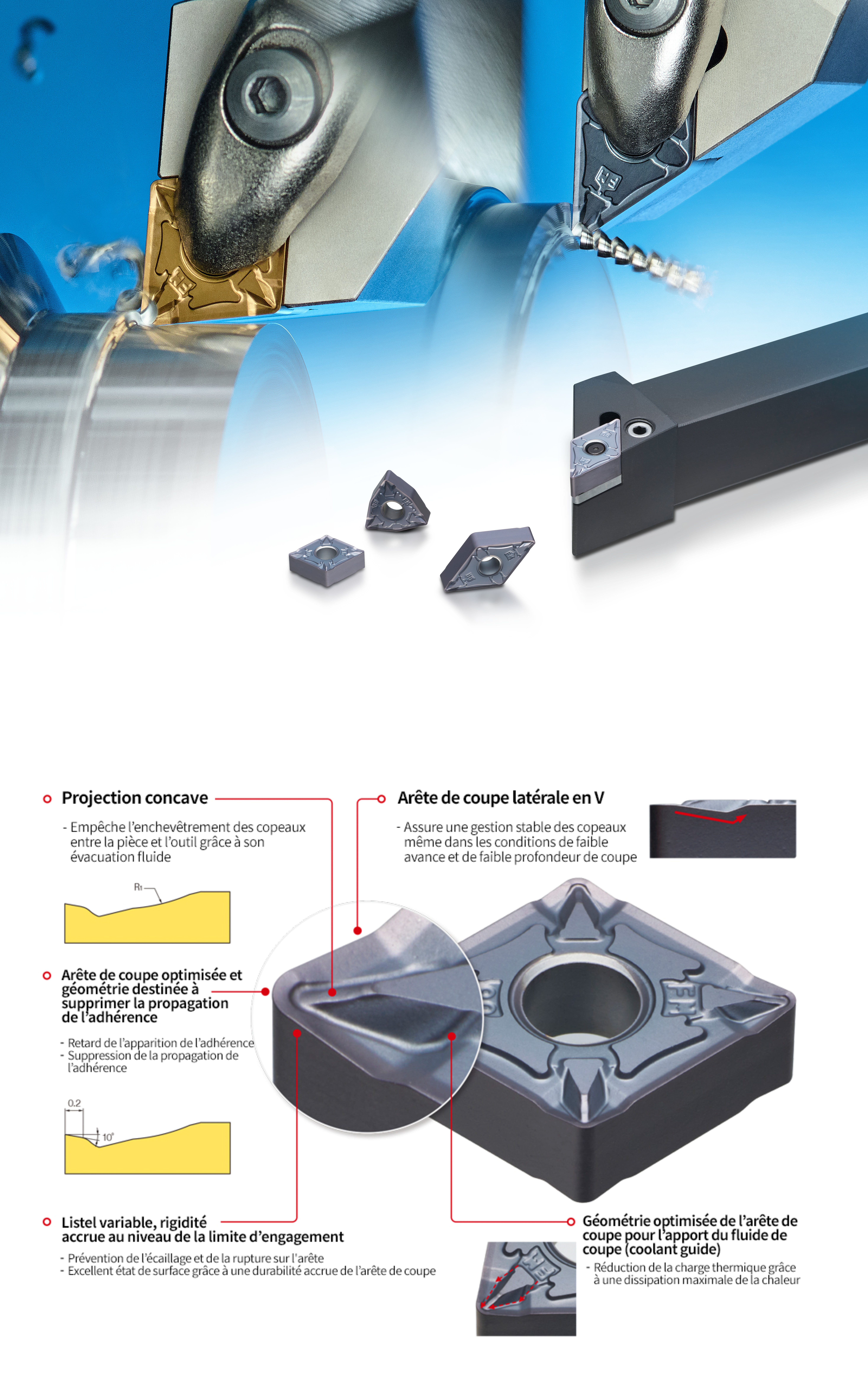 KORLOY a lancé le nouveau brise-copeaux FM, spécialement conçu pour les opérations de finition de l’acier inoxydable, en appliquant une géométrie d’arête de coupe optimisée et une technologie avancée de prévention de l’adhérence, permettant une augmentation remarquable de la durée de vie de l’outil et une gestion stable des copeaux.