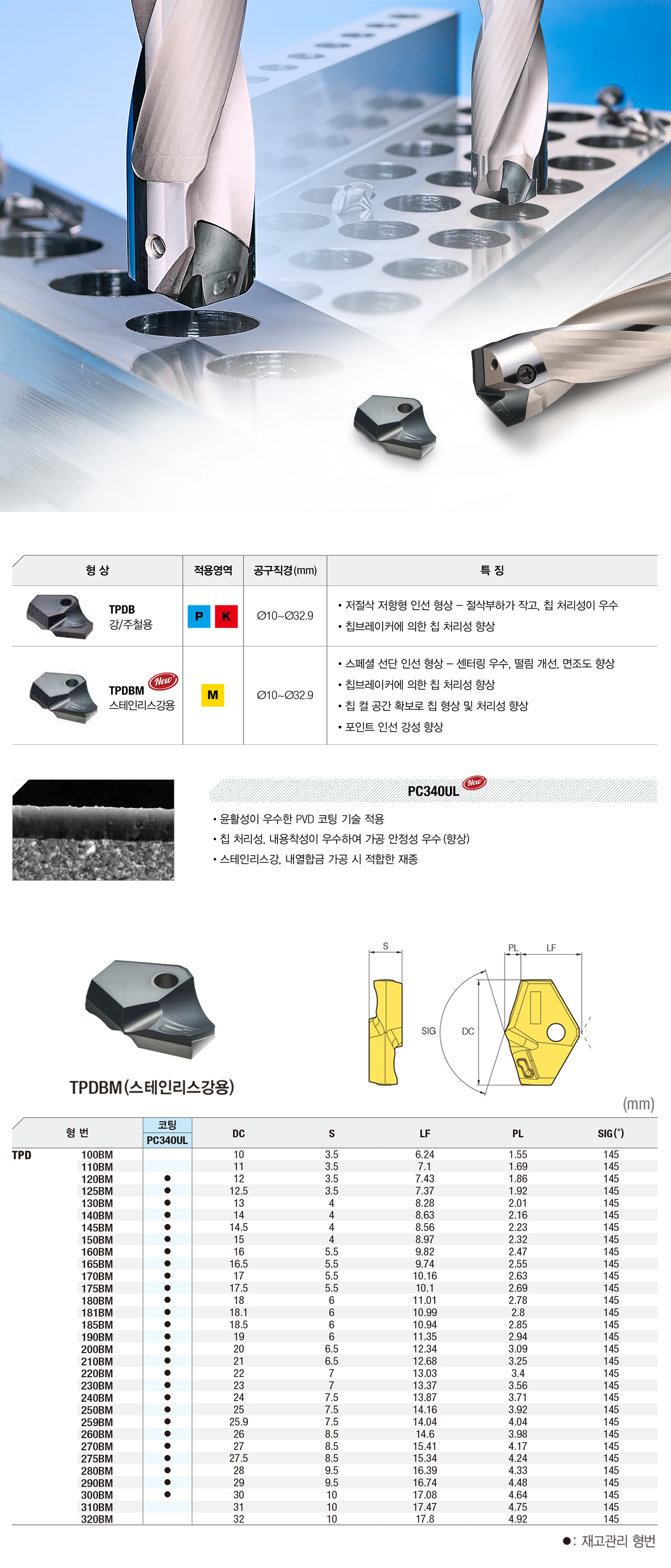 [TPDB Plus Drill] 고품위 & 고능률 탑 솔리드 인덱서블 드릴 TPDB Plus Drill, 스테인레스강 가공용 인써트 TPDBM 형번확대
