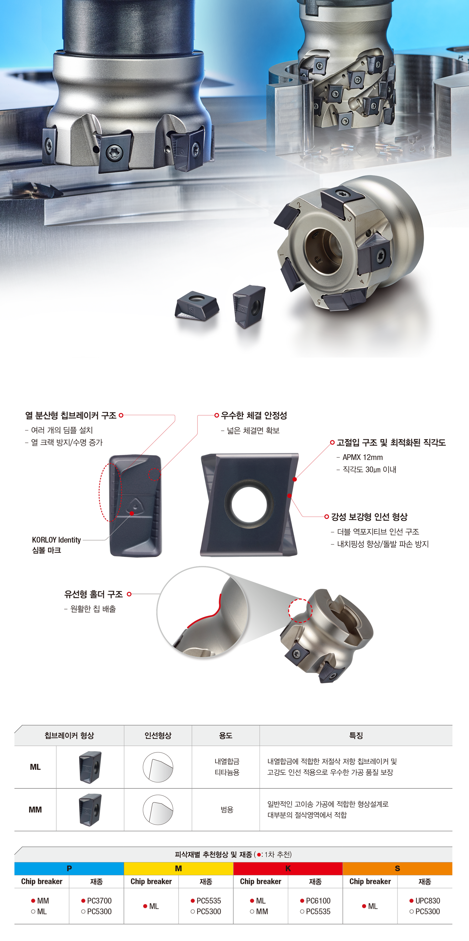 또한, 코오로이의 특화된 다양한 재종의 조합으로 강, 주철 뿐만 아니라 스테인리스강, 티타늄 합금 등의 다양한 피삭재에 적용이 가능하며, 특히 황삭 가공에서는 탁월한 성능을 발휘합니다.