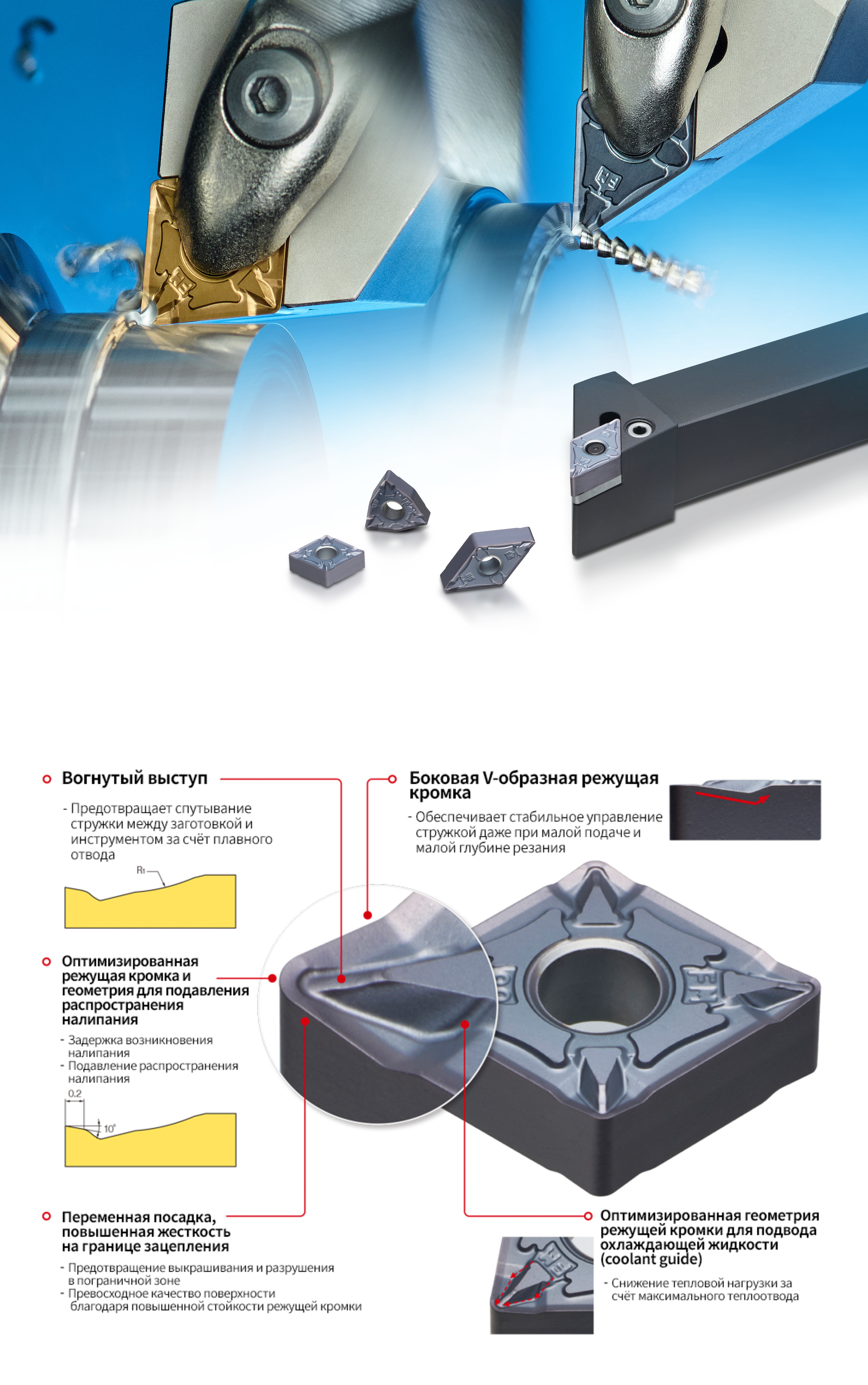 Стружколом FM обеспечивает максимальное управление стружкой при малой глубине резания и низкой подаче благодаря боковой V-образной режущей кромке и вогнутому выступу. Кроме того, геометрия подавления налипания в базовой зоне значительно увеличивает срок службы инструмента при обработке нержавеющей стали. Высокое качество изготовления также гарантирует превосходную размерную точность.