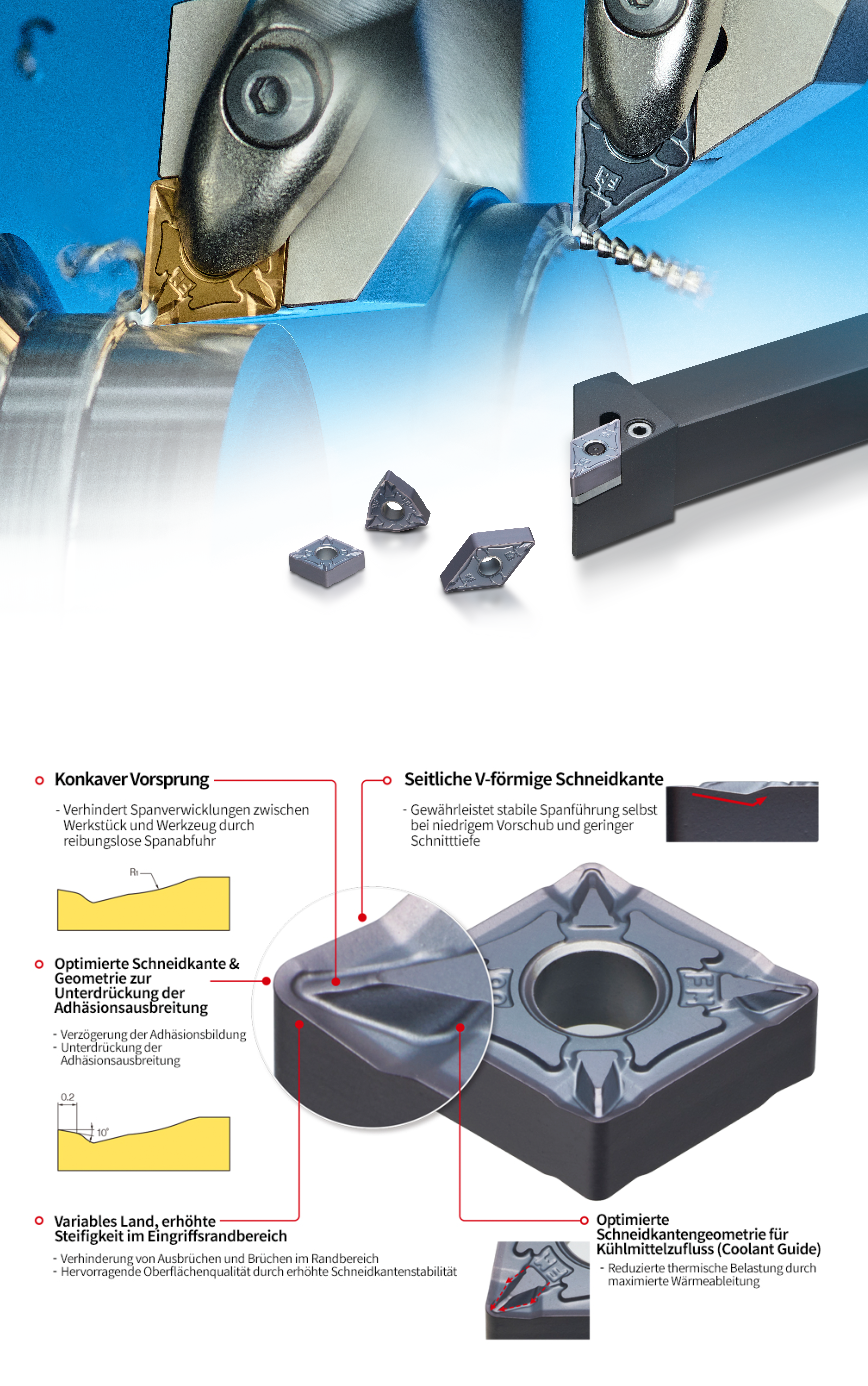 Darüber hinaus verfügt der FM-Chipbreaker über ein variables Landdesign im besonders belasteten Eingriffsrandbereich, das die Steifigkeit erhöht. Dadurch werden Ausbrüche und Werkzeugbrüche effektiv verhindert, während gleichzeitig eine stabile Standzeit und eine hervorragende Oberflächenqualität erzielt werden.