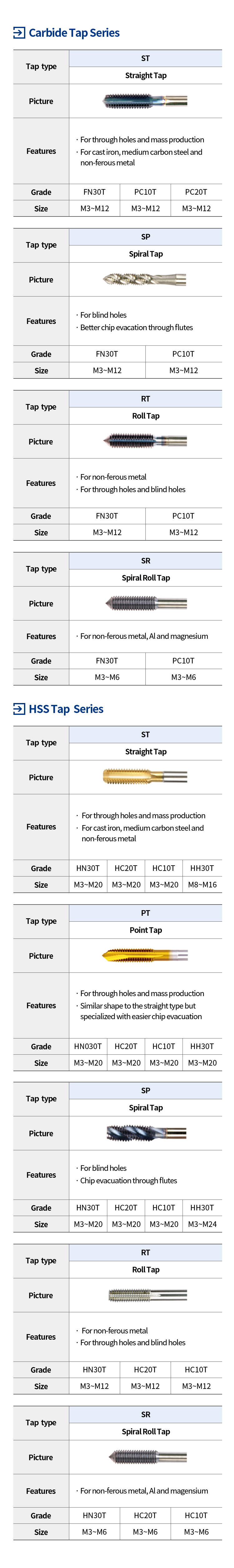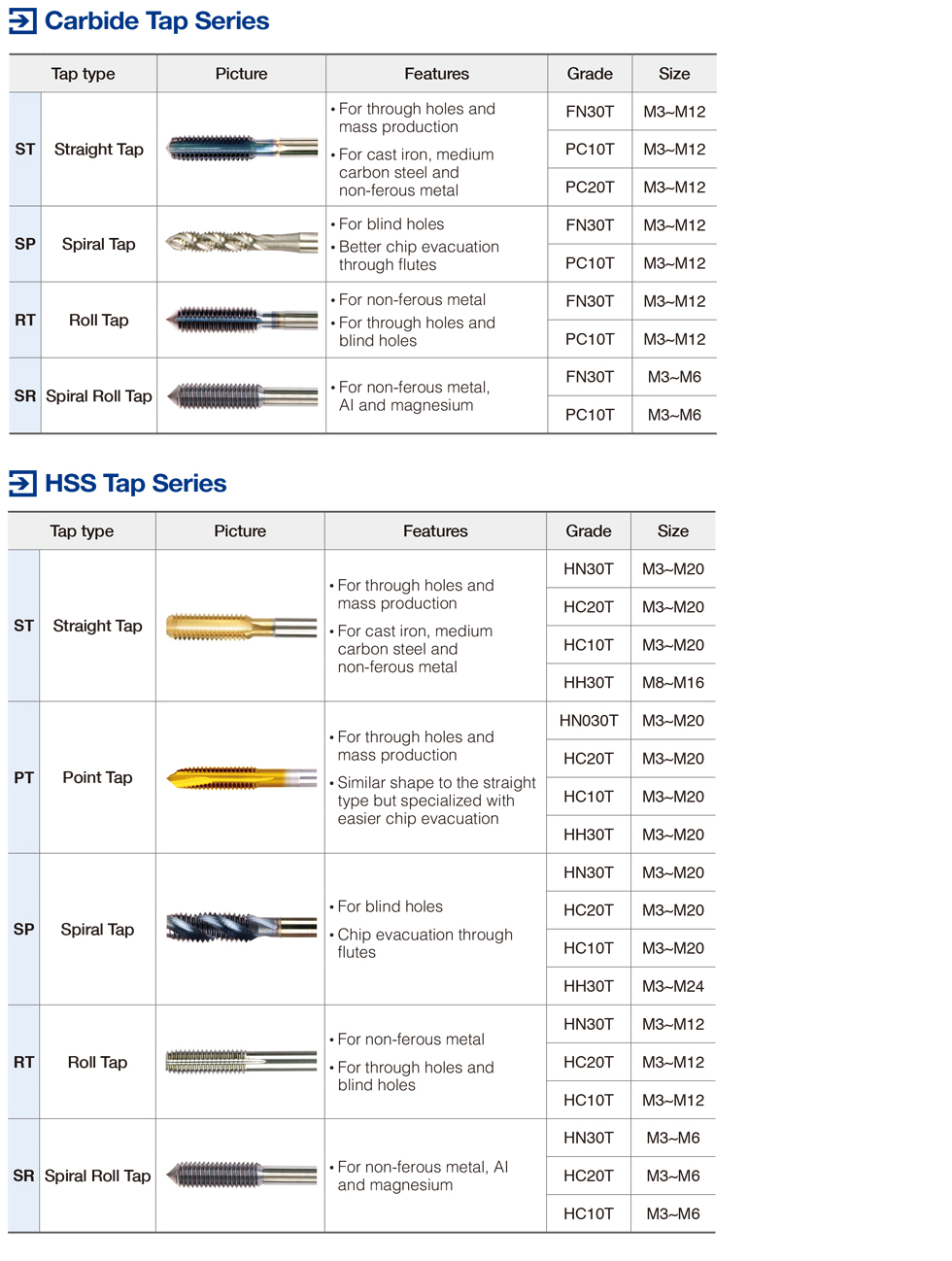 - A wide selection composed of point taps, spiral taps, straight taps, roll taps and more
