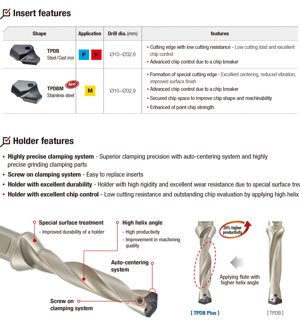 In various industries, there are demands of excellent performance and machining time reduction to improve machining efficiency. Thus, the demand for efficient cutting tools leads to a continuous increase. To respond to these market demands, KORLOY launching the TPDB Plus Drill, a highquality and high-efficiency indexable Drill that enhances machining quality and production efficiency.